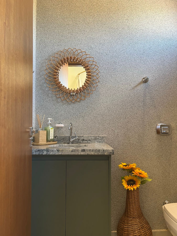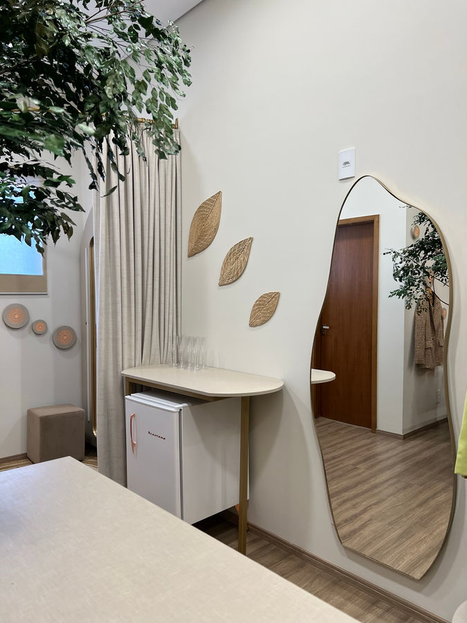 Esse projeto foi elaborado com base na identidade visual da marca, onde as cores principais são o ocre e o bege, e o estilo é o boho. As araras em madeira natural e a árvore preservada chamam a atenção e trazem a personalidade e o aconchego necessários para o ambiente.
